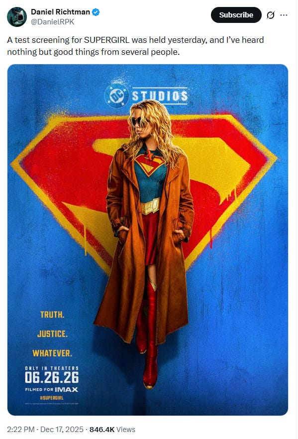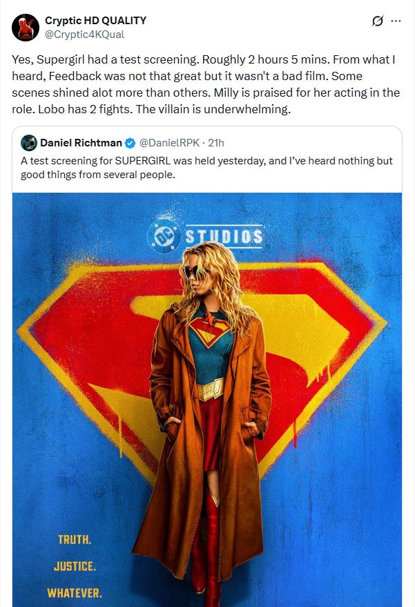 First, scooper Daniel Richtman shared on X, “A test screening for SUPERGIRL was held yesterday, and I’ve heard nothing but good things from several people.”
