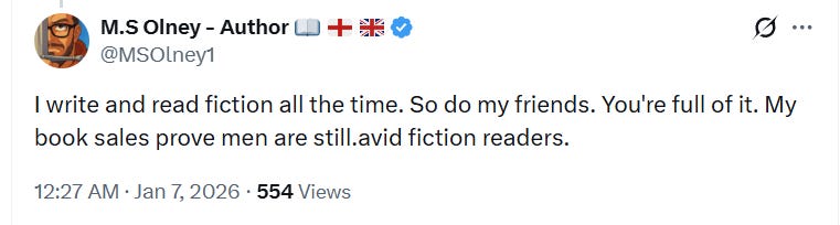 M.S. Olney, the author of The Sundered Crown Saga, reacted, “I write and read fiction all the time. So do my friends. You're full of it. My book sales prove men are still.avid fiction readers.”