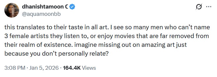 In a subsequent post the user added, “This translates to their taste in all art. I see so many men who can’t name 3 female artists they listen to, or enjoy movies that are far removed from their realm of existence. imagine missing out on amazing art just because you don’t personally relate?”