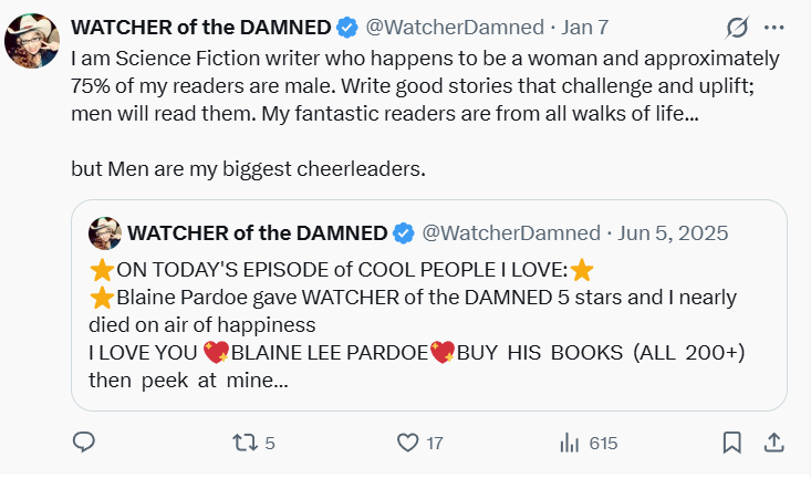 Watcher of the Damned Novelist R.H. Snow replied, “I am Science Fiction writer who happens to be a woman and approximately 75% of my readers are male. Write good stories that challenge and uplift; men will read them. My fantastic readers are from all walks of life...