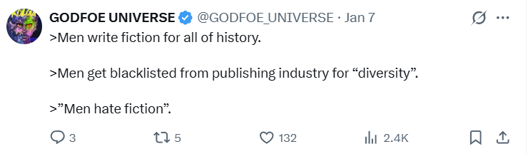 I’ll take the other side of this debate. Note the replies are mostly annec-data. Men read some narrow genres, but studies show that current sales of most categories are dominated by women readers. No surprise, since the publishers are totally captured by Leftist women. Most of their current authors are women, writing for women. Just like Hollywood.