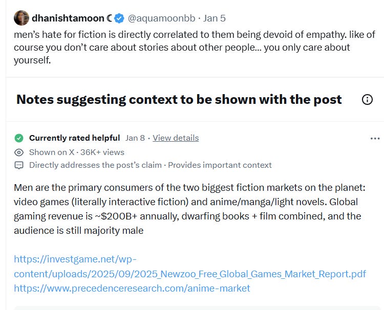 The initial post was community noted. It reads, “Men are the primary consumers of the two biggest fiction markets on the planet: video games (literally interactive fiction) and anime/manga/light novels. Global gaming revenue is ~$200B+ annually, dwarfing books + film combined, and the audience is still majority male.”
