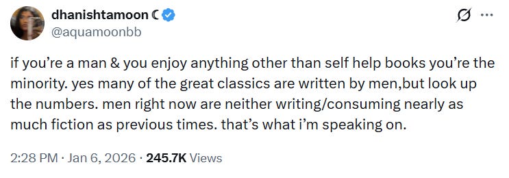 Finally, the user stated, “if you’re a man & you enjoy anything other than self help books you’re the minority. yes many of the great classics are written by men,but look up the numbers. men right now are neither writing/consuming nearly as much fiction as previous times. that’s what i’m speaking on.”