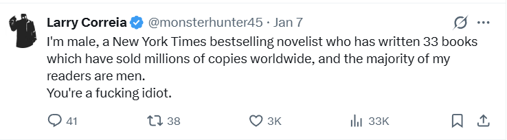 In the comments numerous people blew this fake narrative out of the water. Monster Hunter International novelist Larry Correia wrote, “I'm male, a New York Times bestselling novelist who has written 33 books which have sold millions of copies worldwide, and the majority of my readers are men. You’re a [expletive] idiot.”