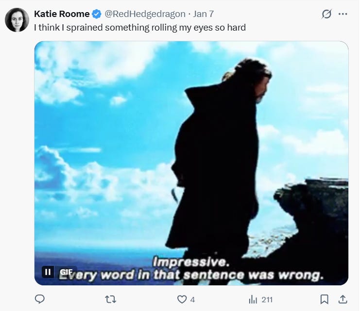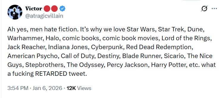 Another individual wrote, “Ah yes, men hate fiction. It’s why we love Star Wars, Star Trek, Dune, Warhammer, Halo, comic books, comic book movies, Lord of the Rings, Jack Reacher, Indiana Jones, Cyberpunk, Red Dead Redemption, American Psycho, Call of Duty, Destiny, Blade Runner, Sicario, The Nice Guys, Stepbrothers, The Odyssey, Percy Jackson, Harry Potter, etc. what a [expletive] RETARDED tweet.”