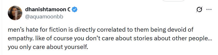 Over on X, the feminist activist posted, “men’s hate for fiction is directly correlated to them being devoid of empathy. like of course you don’t care about stories about other people… you only care about yourself.”