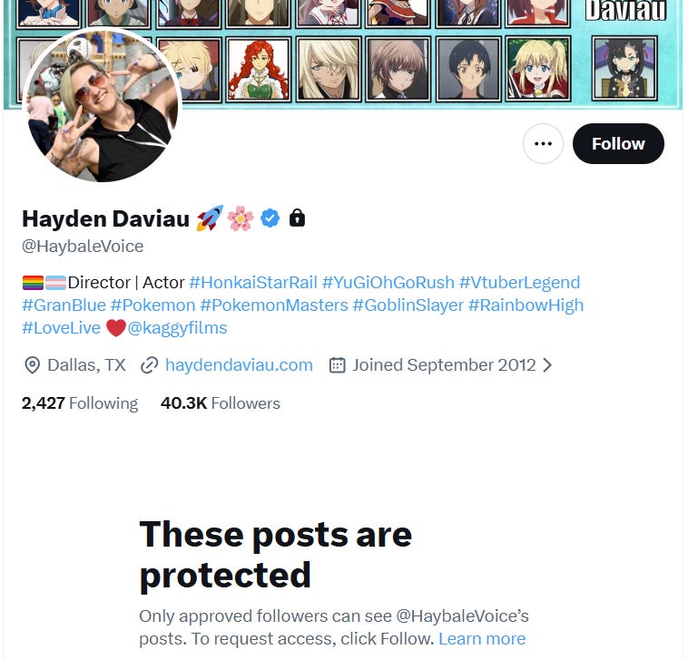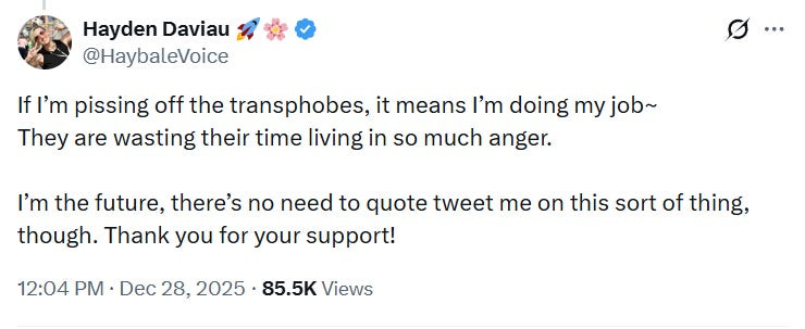 Hayden Daviau, a so-called non-binary trans voice actor, who is in reality a woman protected her X account after previously boasting about “pissing off the transphobes.”