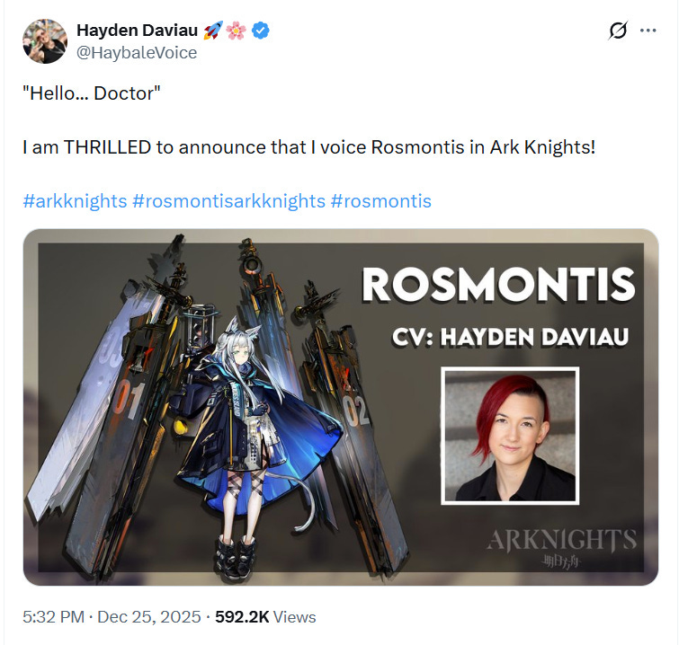 As previously reported, Daviau announced she was the new voice actor for Rosmontis in Arknights on Christmas day writing on X, “I am THRILLED to announce that I voice Rosmontis in Ark Knights!”