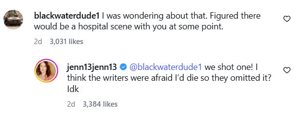In the comments she noted that she did film a scene in the hospital, but it was cut. As for why it was cut she theorized, “I think the writers were afraid I’d die so they omitted it? Idk.”