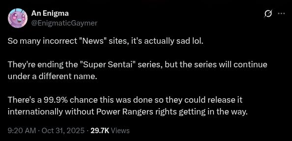 While not confirmed by TV Asahi yet, the network is reportedly planning to rebrand the franchise instead of ending it outright, due to licensing conflicts with Hasbro, which holds the exclusive license to produce Super Sentai-based works and broadcast Super Sentai installments outright worldwide except Japan and certain other countries in Asia, as several X posts have suggested, such as this below: “So many incorrect ‘News’ sites, it’s actually sad lol. They’re ending the ‘Super Sentai’ series, but the series will continue under a different name. There’s a 99.9% chance this was done so they could release it internationally without Power Rangers rights getting in the way.”