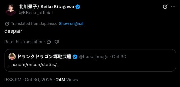 Quoting CNA, award-winning actress-model Keiko Kitagawa reposted the news on her X page and wrote: “Despair”.