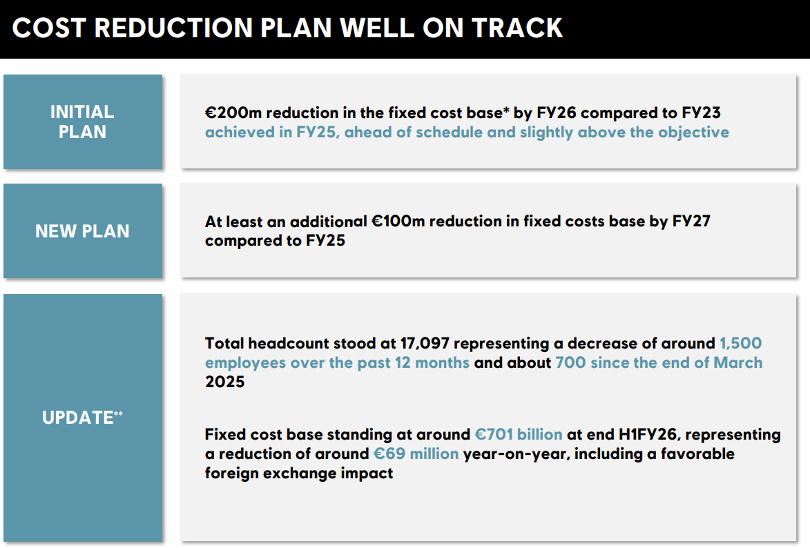 The company also promised to find “an additional €100m reduction in fixed costs base by FY27 compared to FY25.”